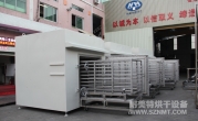 (8)烘干箱內可存放1輛推車。推車配置耐高溫角輪(定向輪、萬向輪各2個),推車里面安裝限位柱用于定位里面托盤,兩側配有L形托架,用于支撐及左右限位托盤。進出口裝有手動爐門。頂部部置循環風機、蒸氣換熱器等裝置,排廢風機安裝在爐體頂部。